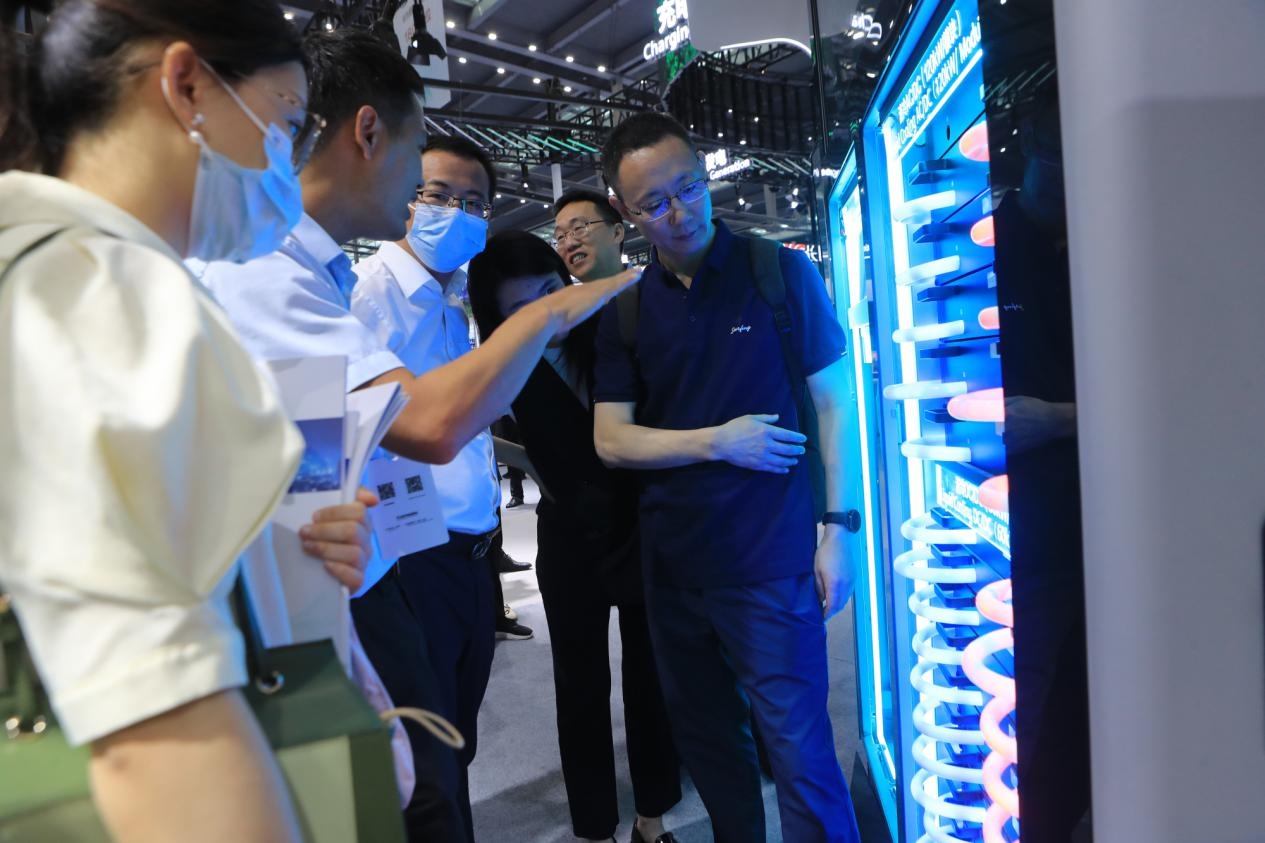 Lors de l'exposition, Huawei et China Southern Power Grid ont présenté une maquette de station de super recharge. Cette dernière, fruit de leur collaboration, est équipée d'un système de refroidissement liquide.