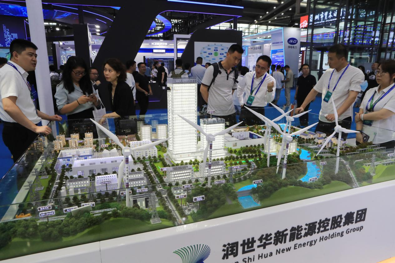 Maquette sur table de sable illustrant des scénarios énergétiques présentée au stand du Run Shi Hua New Energy Holding Group, basé à Shenzhen, lors de l'exposition. Images prises par Sun Yuchen