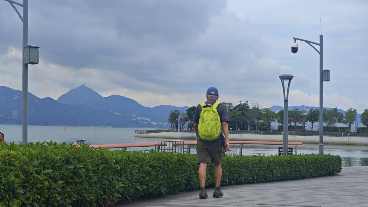 Un visiteur se promène sur la promenade en bord de mer au parc côtier de la baie de Taizi. Photos de Wei Jie