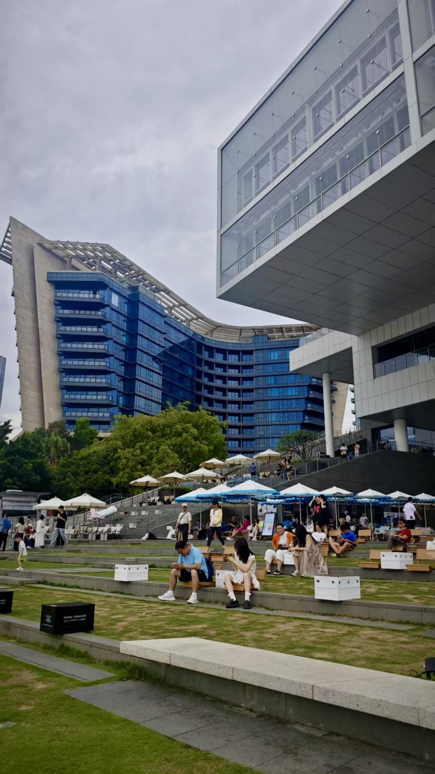 Des visiteurs se reposent sur l'esplanade devant le Centre culturel et artistique Sea World.