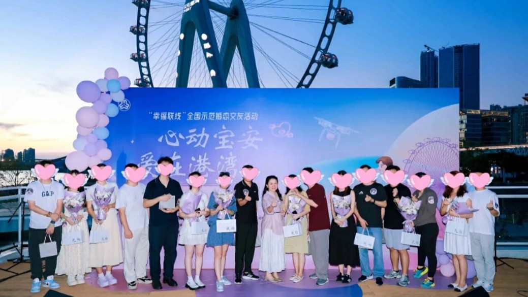 Les jeunes participants se rassemblent pour une photo de groupe sous la grande roue illuminée Bay Glory lors d'un événement de rencontres organisé dans l'arrondissement de Bao'an le 14 septembre, dans le cadre d'une campagne interrégionale pour favoriser les rencontres amoureuses. Photos provenant du compte WeChat « 深i她 », sauf indication contraire.
