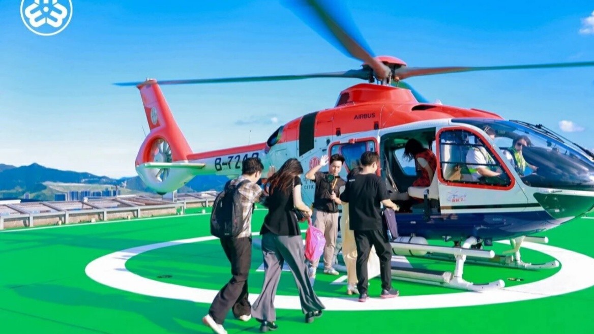 De jeunes participants montent à bord d'un hélicoptère lors d'un événement de rencontre organisé par le gouvernement de l'arrondissement de Luohu le 13 septembre, offrant une vue imprenable sur les toits de Shenzhen dans le cadre de l'expérience de l'économie à basse altitude de la ville.