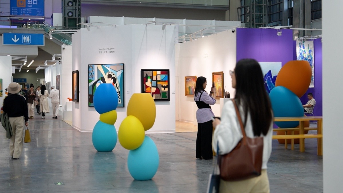 Des passionnés d'art découvrent des installations et des peintures provenant de galeries internationales lors de la 12e édition d'Art Shenzhen, au Centre des congrès et des expositions de Shenzhen, dans le district de Futian. Photos de Lin Jianping